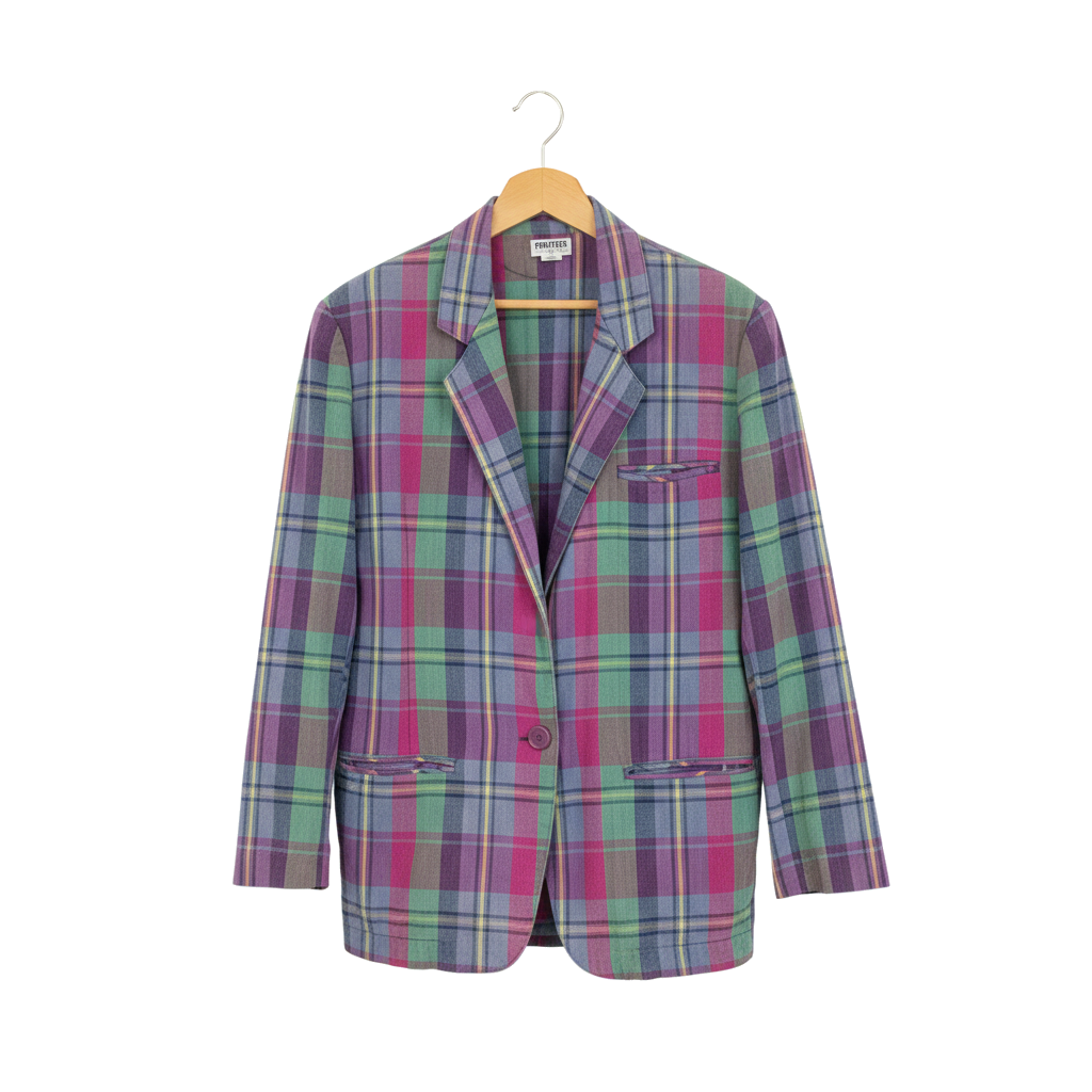 80年代らしい遊び心を感じさせる、カラフルなチェック柄のテーラードジャケット。